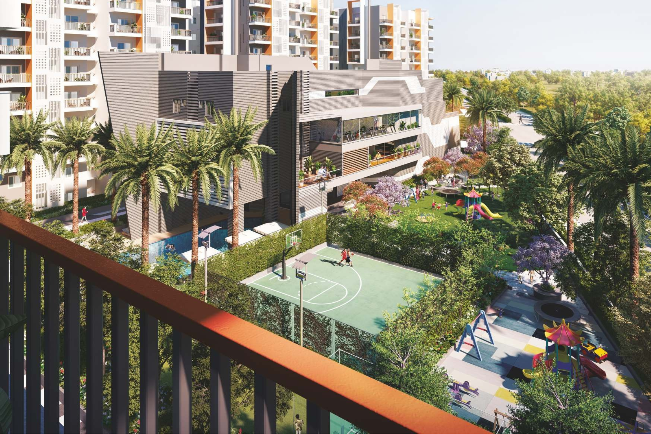 Amenities include: clubhouse, gymnasium, spa/sauna, sports courts (badminton, basketball), kids play area, jogging track, 24×7 security, power backup.